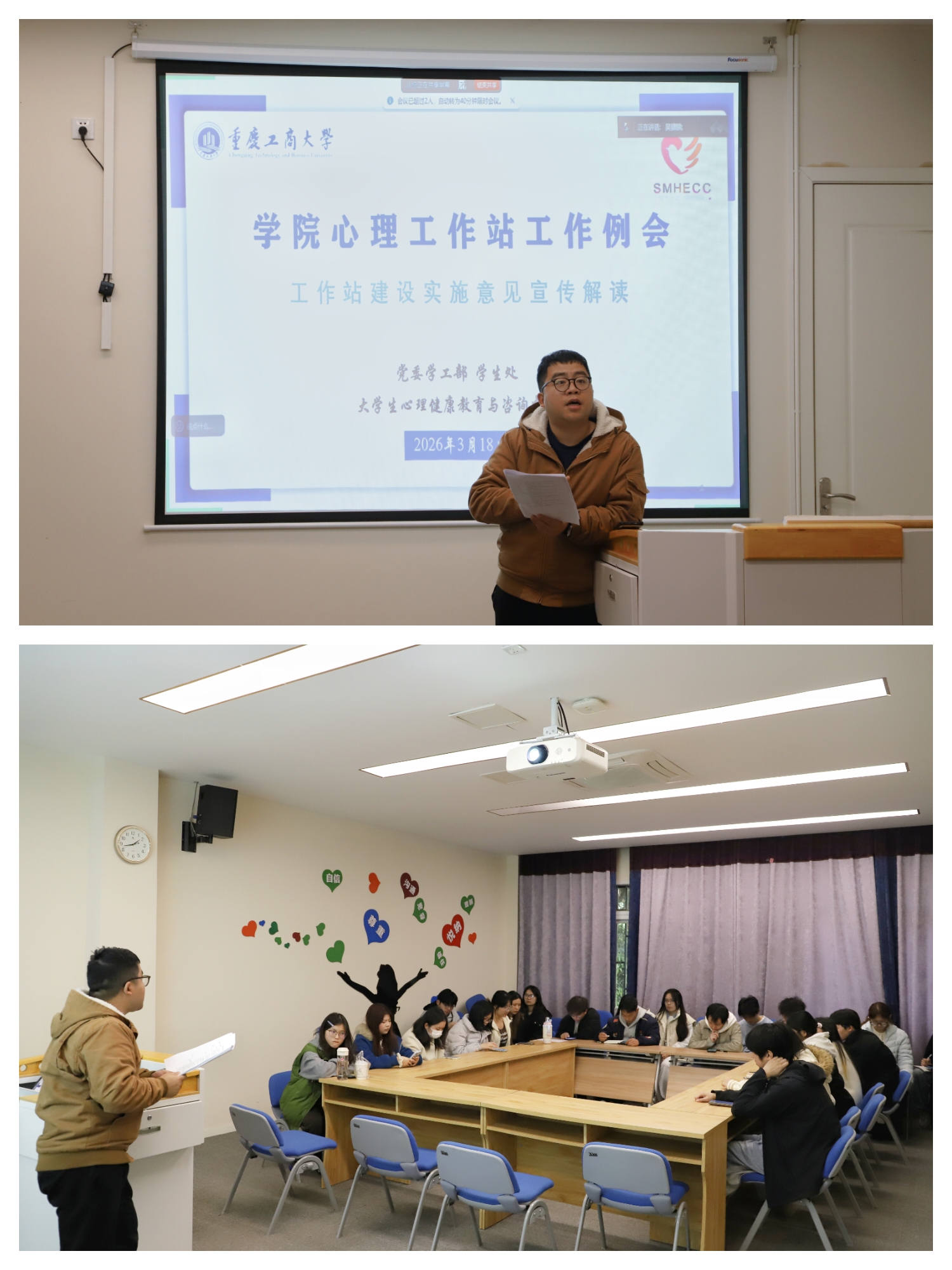为进一步推动我校二级心理工作站科学化、规范化、特色化运行,3月18日中午,我校二级心理工作站会议在南岸校区心理中心召开。本次会议由党委学工部学生处大学生心理健康教育与咨询中心主办,茶园校区同步开启线上直播。会议由心理中心吴骕騻老师主讲,各学院二级心理工作站站长、副站长参会。