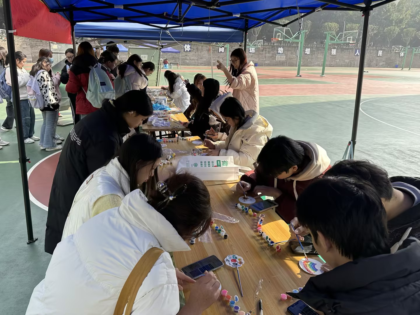 此次活动以引导学生多元理解生命价值、缓解心理焦虑为核心目标,通过集体共创的形式,让青年学子在轻松互动中感受个体与集体的联结力量。活动当天,众多学院学生踊跃参与,在工作人员的指引下有序签到后投入到创作环节。在活动现场,同学们首先从盲盒中随机抽取写有自然事物的纸条,“一片落叶”“一只流浪猫”“一朵野花”等充满生命力的意象,成为大家探索生命意义的灵感起点。随后,大家在圆形画纸上用多彩画笔勾勒事物形态,再以1-2句精炼短句抒发对生命的感悟——有人借“青松”表达“坚韧生长,向阳而生”的信念,有人以“溪流”传递“涓滴汇聚,生生不息”的思考。创作过程中,同学们相互交流想法、分享心得,篮球场上洋溢着温馨热烈的氛围。