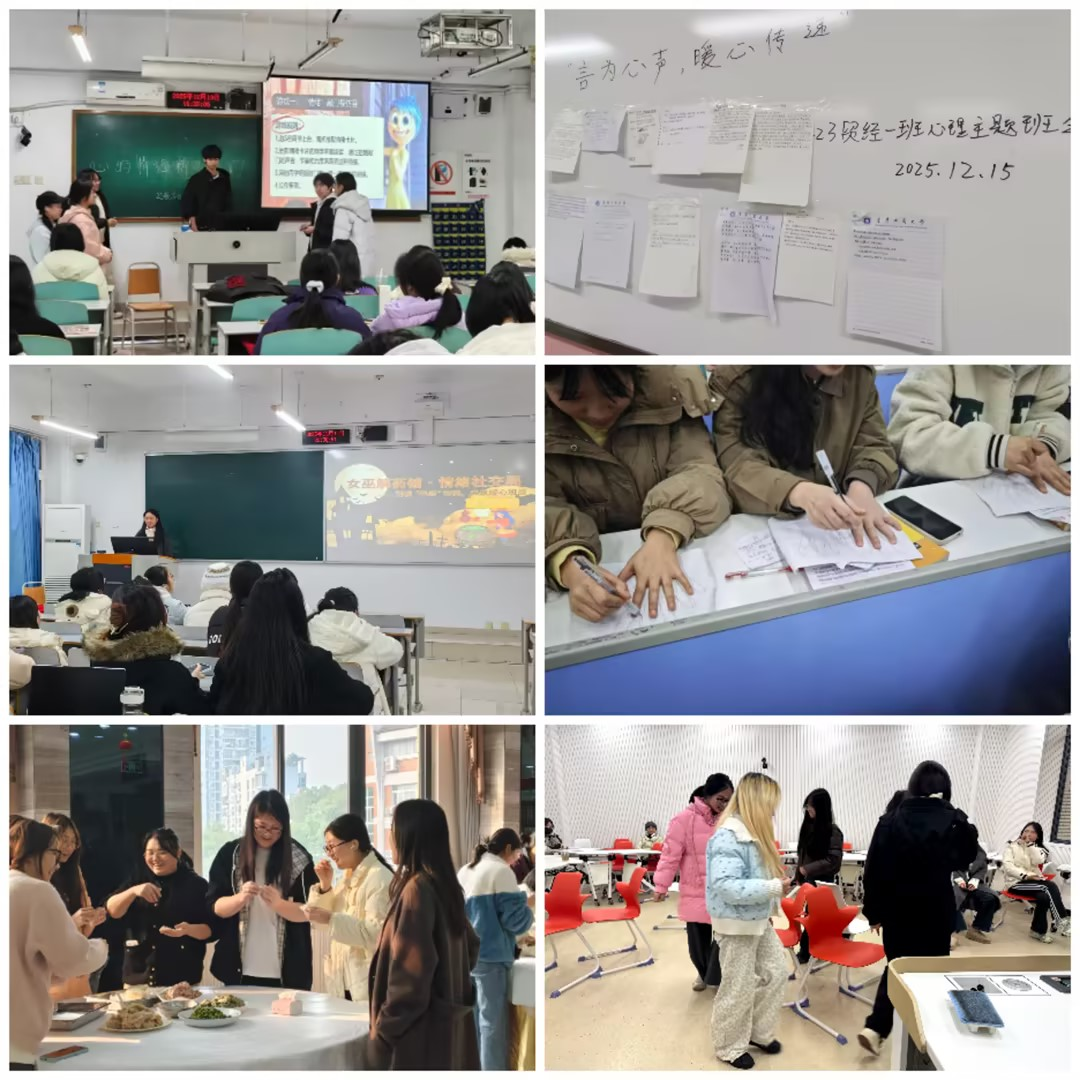 盲盒解锁:趣味互动传递无声关怀。活动中创新设计的盲盒解密环节让心理关怀在趣味中悄然流淌:25数字经济班的“情绪盲盒”、23贸经一班的“心灵漂流瓶”、23经济学二班的“女巫解药瓶”……同学们匿名写下自己的烦恼、喜悦或感激之情,投入其中进行随机交换与分享。当“复习压力大难以入眠”、“和室友闹矛盾心生委屈”等心声被读出时,总有身边的同学伸出援手,分享实用的情绪调节方法;当“感谢你帮我补习功课”、“你在团队中总能带动氛围”等暖心话语被展示时,教室里总会响起会心的笑声与真诚的掌声。陌生与隔阂,就在这份温暖的分享与共鸣中悄然消散。