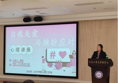 为深入推进大学生心理健康教育工作,引导学生提升心理韧性、掌握自我关爱的能力与应对挫折的方法,2026年4月13日中午,会计学院心理工作站在南岸校区图书馆视听预览室成功举办了“自我关爱与挫折应对”心理主题讲座。本次讲座特邀学校心理健康教育与咨询中心专职教师钟歆副教授担任主讲,会计学院陈曦老师出席并作开场致辞,吸引了众多学生到场聆听学习。